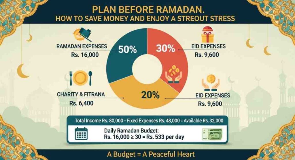 Ramadan is 30 days. If your Ramadan budget (the 50% part) is, for example, Rs. 15,000, then your daily budget would be: